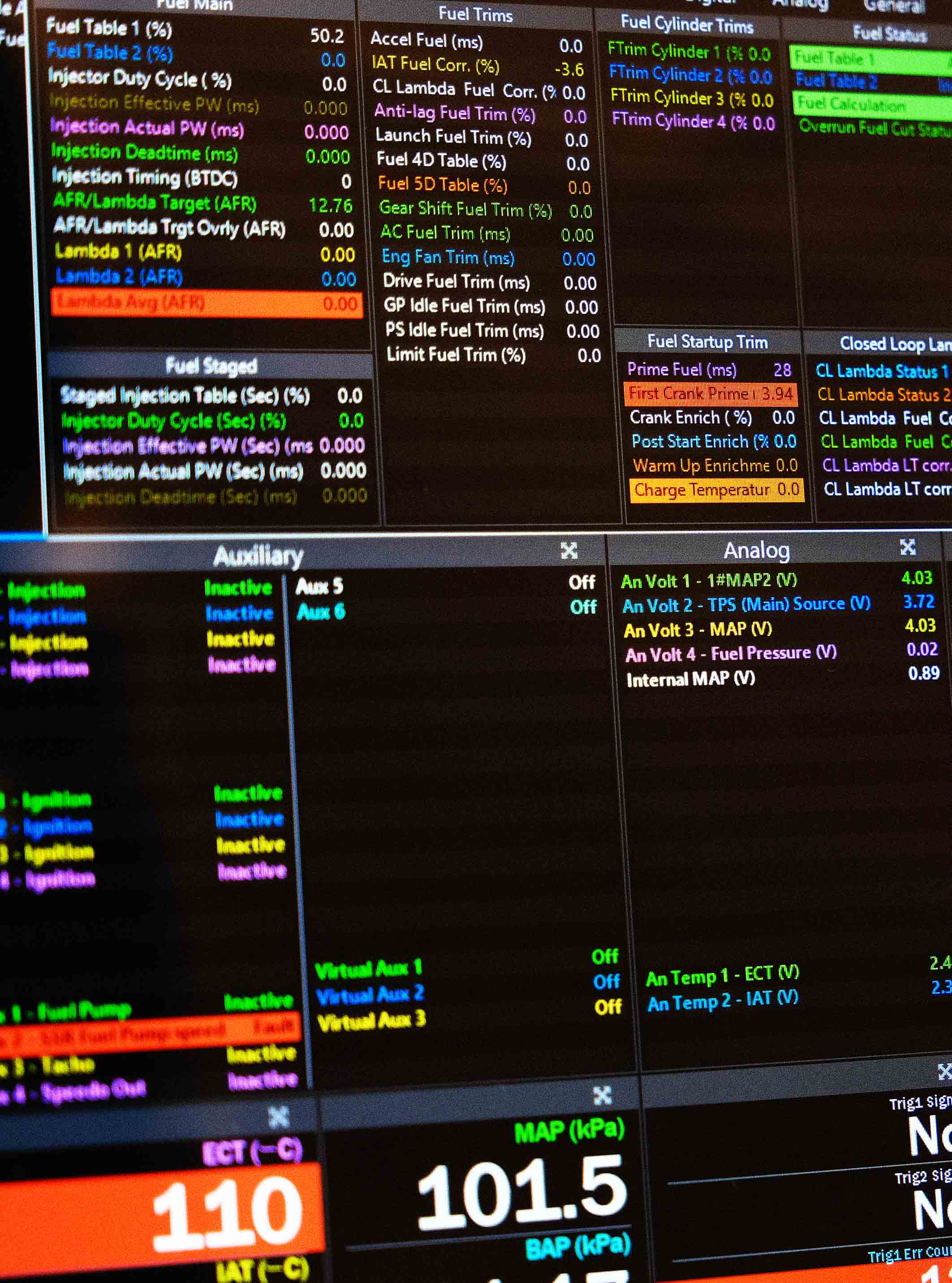 フルコンECUに接続し、計測した各種データで点火時期や燃料噴射の補正制御を行う為の追加センサー類です。