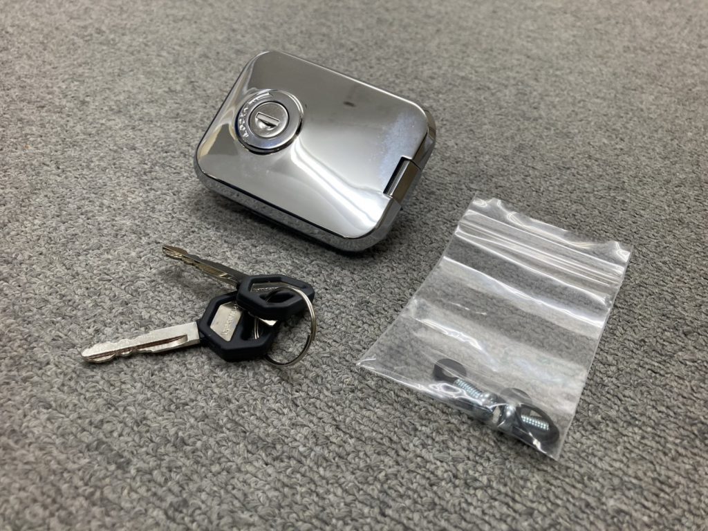 タンクキャップ本体にキーシリンダー、取り付けに必要なOリング、ワッシャー、ビス及びスペアキーを含む専用キー2本付き。
