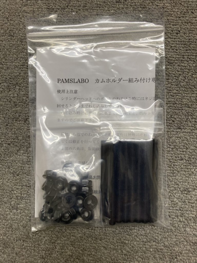 シャコ万と呼ばれる小型バイスを併用しながらシリンダーヘッドへのカムシャフトの組み付け時にこれらのボルトを使用する事で、バルブスプリングの反力によるヘッド側雌ネジを一切痛めること無く作業を行う事が出来ます。